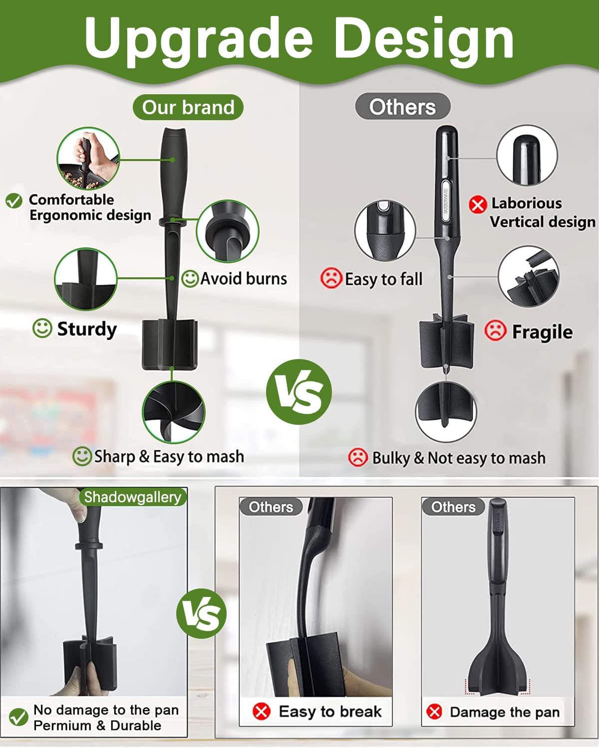 Introducing the versatile Hand Masher from Shadowgallery, your go-to kitchen companion for effortless cooking. Designed to replace traditional utensils like forks and spoons, this innovative mix chopper simplifies the process of breaking down ground meat and other foods. Shadowgallery, a specialty manufacturer of kitchen accessories and lifestyle goods, is dedicated to creating products that solve everyday challenges. Our mission is to enhance your cooking experience while protecting your cookware.