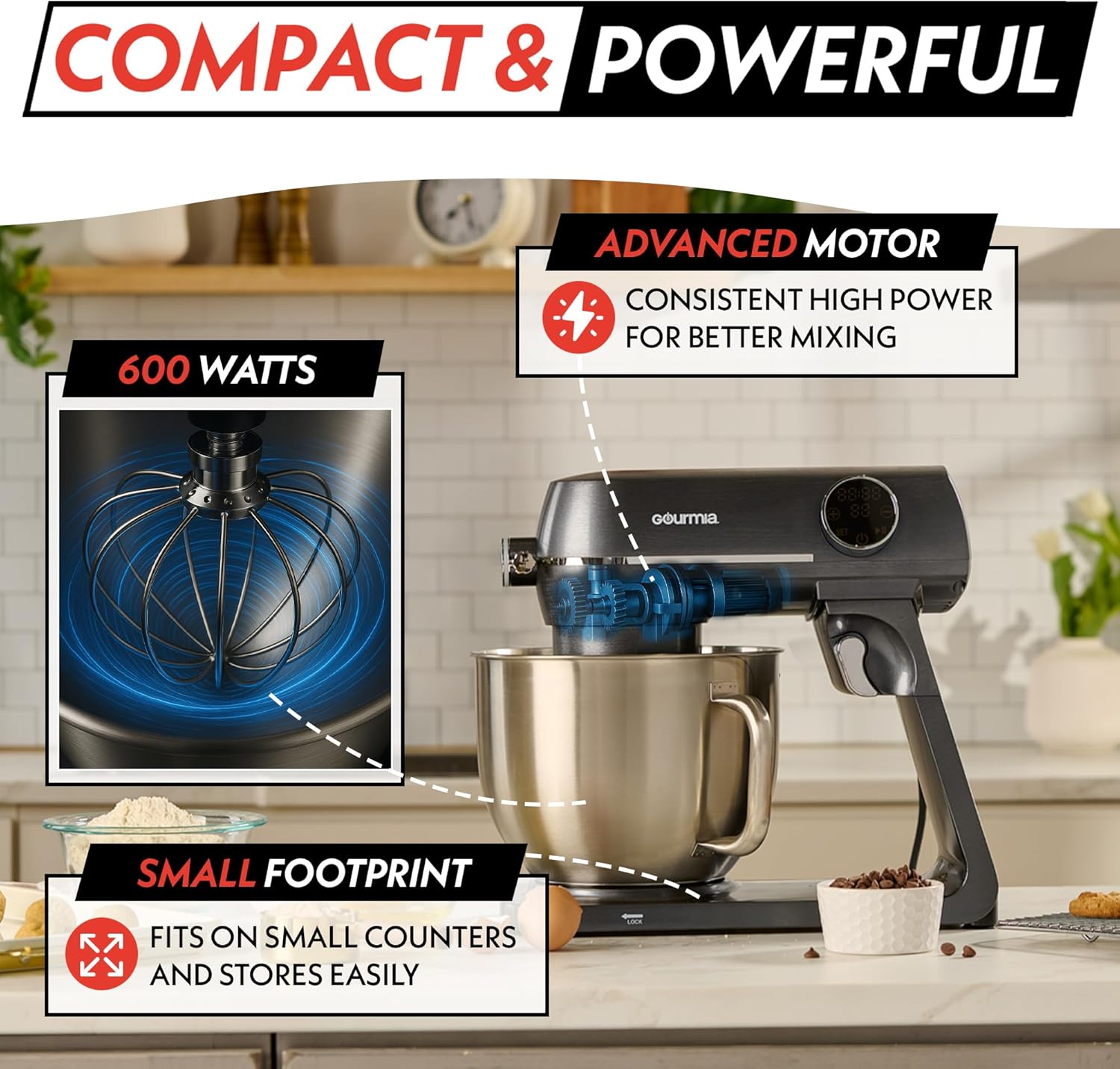 – Tilt-head design with splash guard for easy ingredient addition