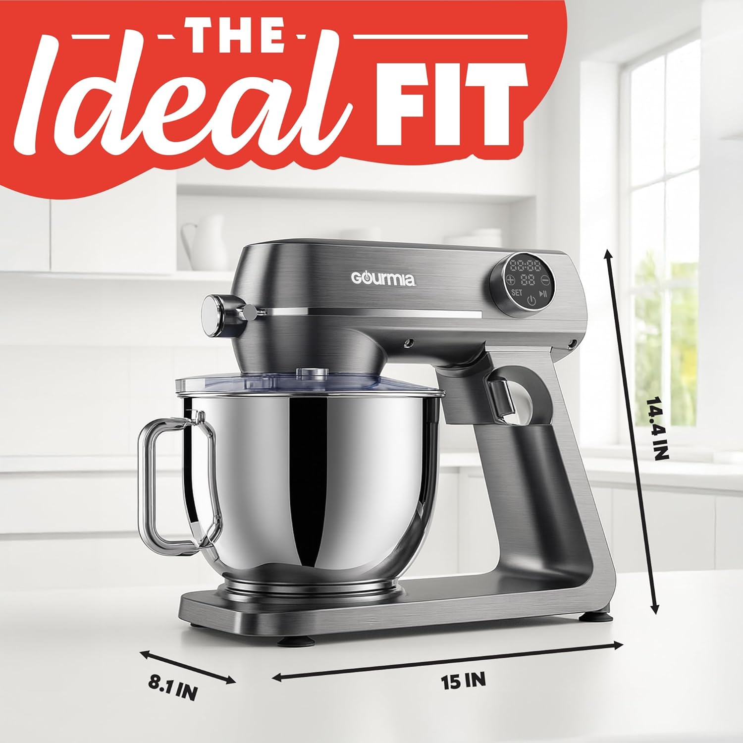 Suction feet keep the mixer steady during use, and its dishwasher-safe parts and smooth surfaces ensure easy cleanup. All of this comes in a space-saving 15” × 8.1” × 14.4” design that’s perfect for everyday kitchen use.