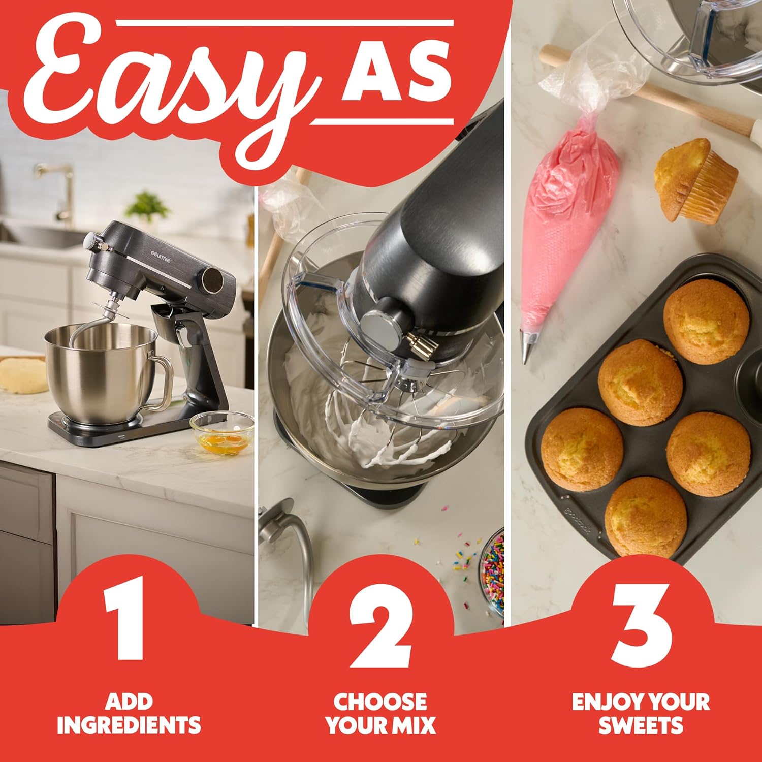 This mixer includes a whisk, dough hook, and flat beater to meet all your baking needs. The tilt-head design and clear splash guard make it simple to add ingredients without creating a mess.
